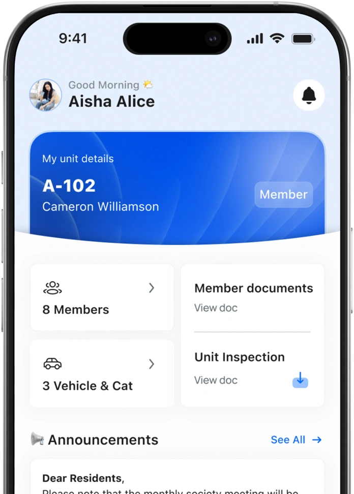 - Shared calendar and notification system for events, inspections, garbage days, and more.