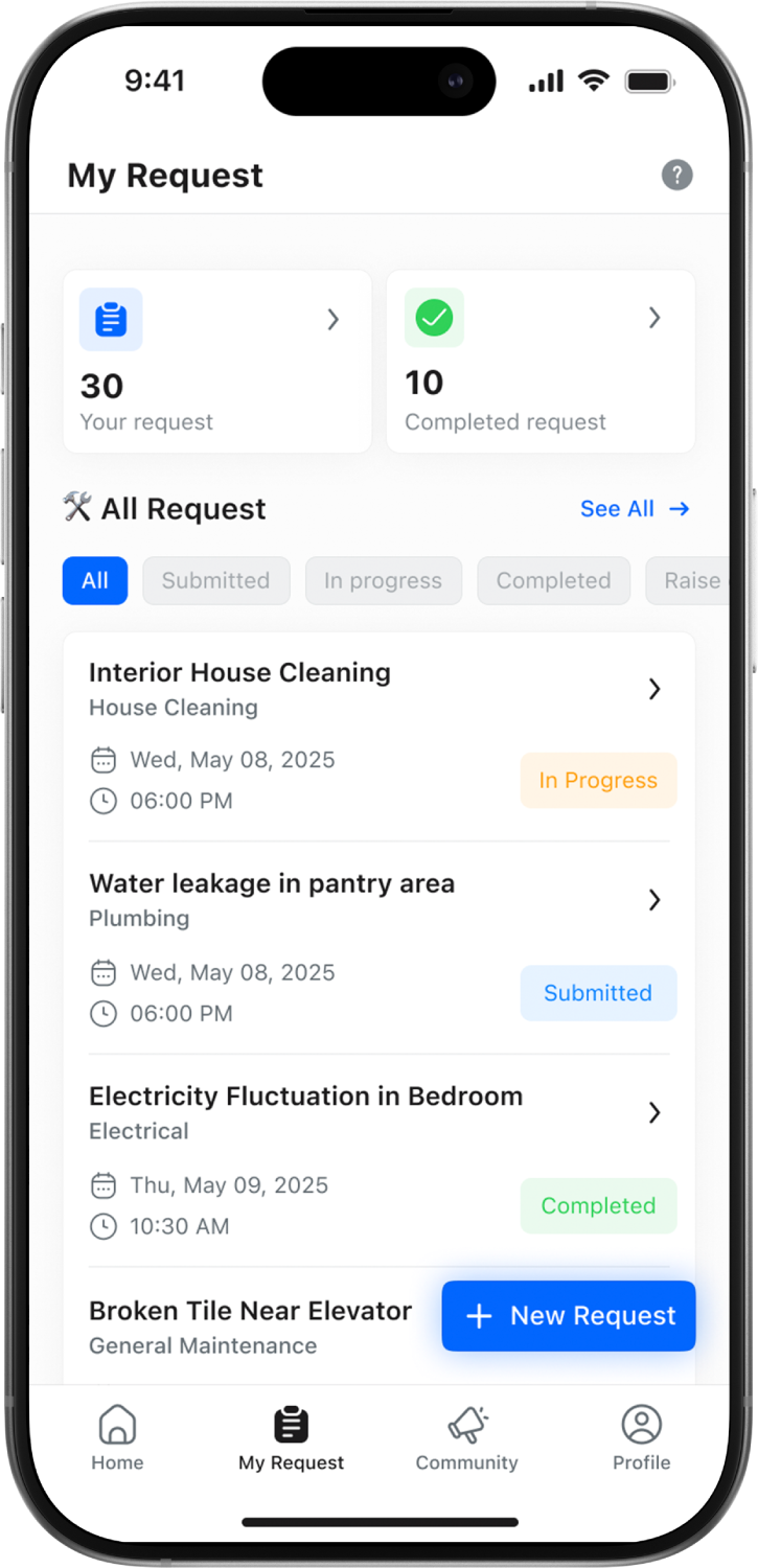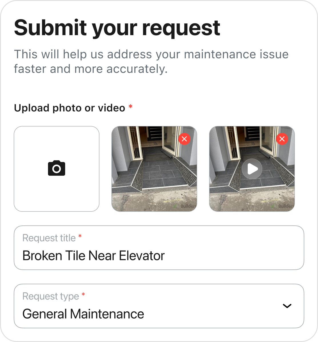 - A centralized maintenance request system with photo attachments, status tracking, and contractor integration.