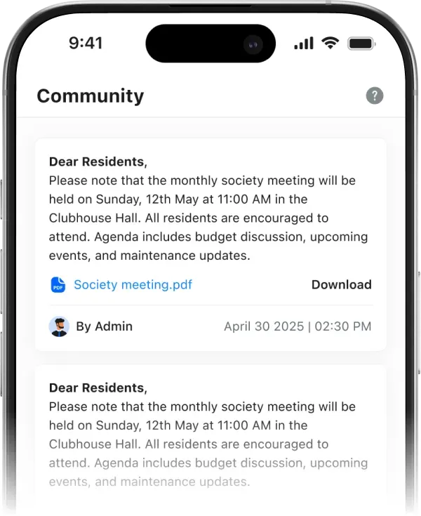 Administrator can create important notices (e.g., late payment reminders, unit inspections).